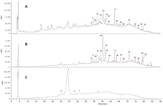 The main phytochemicals present in AHE were tentatively identified by HPLC-DAD-ESI-MSn. As presented in Figure 1, the obtained chromatograms allowed the identification of 25 phenolic compounds using positive and negative ionization modes, namely anthocyanins and other flavonoids. The tentatively identified compounds are summarized in Table 1 and Table 2, and were identified based on bibliographic references, MassBank data and by comparison with standards MS and UV spectra.