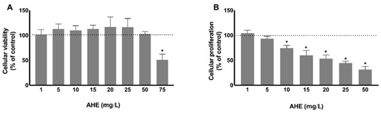 Cytotoxicity and antiproliferative capacity were assessed in HMEC-1 treated with different concentrations of AHE during 24 h. Metabolic activity was determined by MTS assay (A). AHE induces cytotoxicity at the highest concentration tested (75 mg/L), in comparison to control. Proliferation was evaluated by BrdU incorporation (B). There is an inhibition on HMEC-1 proliferation after treatment with AHE, in a dose-dependent manner. Results are expressed as % of control group. * p < 0.05 vs. control.