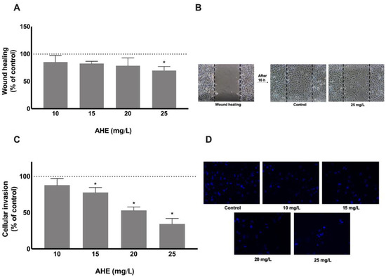 The ability to impair HMEC-1 migration and invasion was performed after 16 h and 24 h treatment with AHE by injury assay (A,B) and matrigel-coated transwell assay (C,D), respectively. There is an abrogation in cell motility and the capacity to migrate to the wound area was reduced at a concentration of 25 mg/L (A). Dotted lines represent the wound healing area at the beginning of experiment (B). HMEC-1 invasive capacity through a matrigel membrane was reduced in a dose-dependent manner with significance for doses of 15 mg/L or higher (C). Representative images of invasive HMEC-1 under fluorescence microscope (D). Results are presented as % of control group mean ± SD. * p < 0.05 vs. control.