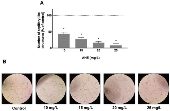 Formation of capillary-like structures was quantified in HMEC-1 after treatment with AHE or control, by Matrigel assay. HMEC-1 reduces, dose-dependently, its ability to assemble into tubular structures in concentrations ranging from 10 to 25 mg/L (A). Representative images of endothelial assembly after 16 h of standard treatments. (B) Results are expressed as % of control group. * p < 0.05 vs. control.