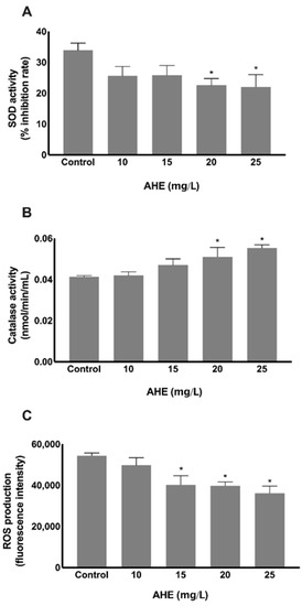 Evaluation of oxidative stress mediators after HMEC-1 treatment with AHE or control. Antioxidant SOD (A) and catalase (B) defenses were both augmented at concentrations of 20 and 25 mg/L, in comparison with control group, analyzed by enzymatic assays. Production of reactive oxygen species (ROS) was reduced dose-dependently, measured after incubation with fluorescence dies, with statistical significance at 15 mg/L or higher (C). Results are presented as % inhibition rate of SOD activity (A) nmol of catalase activity/min/mL (B) and units of fluorescence intensity for ROS production (C) * p < 0.05 vs. control.