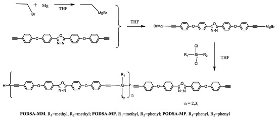 An example of the use of the Grignard reaction is a synthesis of the silicon-containing arylacetylene resins with oxadiazole moieties [40]. In a standard procedure using magnesium powder, bromoethane, and 2,5-bis(4-(4-ethynylphenoxy)phenyl)-[1,3,4]oxadiazole, followed by an appropriate silane derivative (methylphenyldichlorosilane, dimethyldichlorosilane, and diphenyldi-chlorosilane), PODSA-MP, PODSA-MM, and PODSA-PP resins were obtained (Scheme 5).