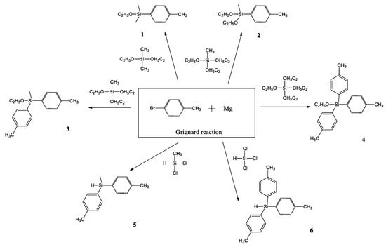 Synthesis of p-tolylalkoxy- and p-tolyl(hydrido)silanes 1–6 by the Grignard reaction [41].