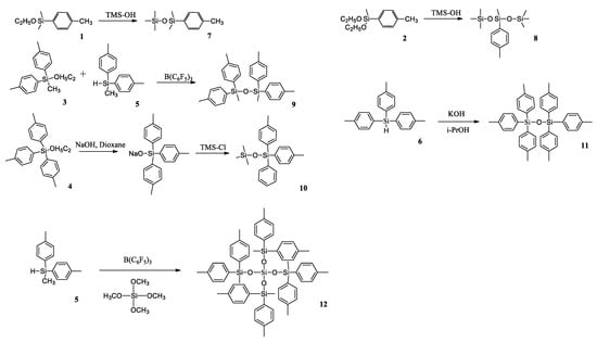 Further, based on p-tolylsilanes 1–6, they obtained a series of p-tolylalkoxysilanes 7–12 by a variety of synthetic approaches, e.g., by a condensation of the corresponding alkoxysilanes with excess trimethylsilanol in the presence of acetic acid or by refluxing in dioxane with sodium hydroxide, followed by blocking the reaction with trimethylchlorosilane (Scheme 7). This method, as the authors claim, will find practical application in the future for synthesizing symmetric disiloxanes due to the inexpensive and commercially available reagents used and simplicity of the reaction conditions.