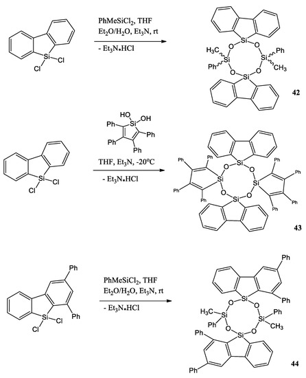 Another interesting example of silole is a work by Y. Cai et al. [50]. They report the synthesis, characterization, and photophysical properties, including aggregation-enhanced emission (AEE) characteristics of cyclotetrasiloxanes 42–44 containing different silole-based fluorogenic units (silafluorene, 1,3-diphenyl-9-silafluorene, tetraphenylsilole) (Scheme 10). 9,9-Dichloro-9-silafluorene, 9,9-dichloro-1,3-diphenyl-9-silafluorene, dichloro(methyl)phenylsilane, and 1,1-dihydroxyl-2,3,4,5-tetraphenylsilole were synthesized by cohydrolysis and condensation reactions.