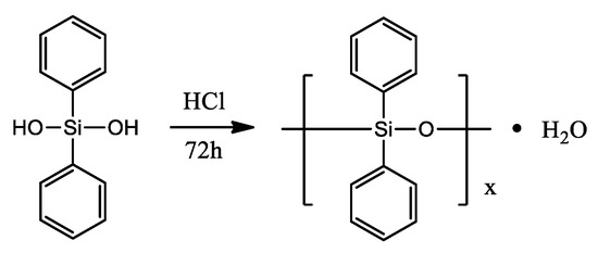 Another interesting example was presented by S. Fan and co-workers [55]. Researchers obtained an inherent flame-retardant polyamide 6 (FR-PA6) containing polydiphenylsiloxane (PDPS) under the action of ethylene glycol (EG) via a facile “two-step” bulk polymerization. Prepared FR-PA6 reached 28.3% of the limiting oxygen index (LOI) and passed the V-0 level of UL94 test with suppressed melt-dripping. After investigating the char residues and pyrolysis volatiles of FR-PA6 after combustion, the formation of a silicon-rich protective layer was proven to be an essential factor to increase the flame retardancy of FR-PA6 via reducing the diffusion of pyrolysis volatiles, restricting the heat transfer and mass loss, as well as preventing polymer melts from dripping. The novel route offered in the work is easily accessible to large-scale industrial fabrication. Polydiphenylsiloxane (PDPS) was prepared by dehydration condensation according to the literature [56], and the synthetic route is shown in Scheme 15. FR-PA6 was prepared by two-step polymerization. The chemical structure of FR-PA6 is shown in Scheme 16.