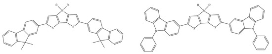 H. Park et al. synthesized a group of dithiensiloles based on fluorene and carbazoles (DTS), which were then tested for their thermal, photophysical, and electrochemical properties (Scheme 21). All properties confirmed that the compounds could be used as basic materials for red emitters in OLED. All compounds showed reversible oxidation and had low localized LUMO energy due to the conjugated fluorene/carbazole substituents in DTS. This, together with high fluorescent quantum efficiency, confirms the possibility of using these compounds in OLEDs as emitters, carriers, and materials for electron transport [78].