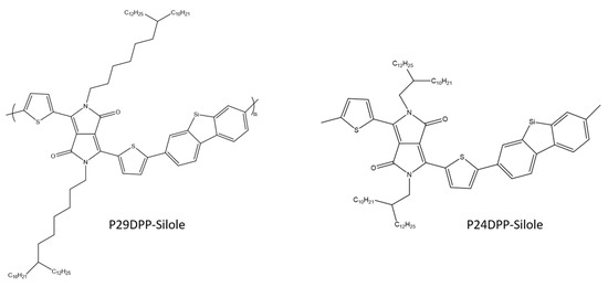 Due to the increasing energy demand, solar cells have become a promising way to harness the inexhaustible clean energy of the sun. Organic solar cells (OSC) consisting of conjugated polymers or small molecules (constituting a mixture of donors) with fullerene derivatives (acting as acceptors) attract special attention due to their unique properties, such as relatively light weight, low production cost, and the possibility of producing large elastic surface. As a result, in the last decade, a significant improvement in the power conversion efficiency (PCE) above 10% was achieved [57,58,59,60,61]. In order to achieve high photovoltaic efficiency, it is necessary to maintain the specific properties of conjugated polymers; in particular, their absorption spectra and the molecular energy levels must be closely matched. The appropriate energy levels of the HOMO and the LUMO not only significantly facilitate exciton dissociation at the donor/acceptor interface, but also generate higher open-circuit voltage (Voc) of OSC devices [57,62]. Despite enormous advances, fullerene derivatives have some inherent disadvantages, such as poor absorption in the visible region, high synthesis cost, difficult modification of energy levels, and poor morphological stability, which makes the use of these compounds in the OSC construction problematic. Therefore, in recent years, a great deal of effort has gone into developing non-fullerene acceptors that combine good stability, easy synthesis, strong visible and near-infrared absorption, and the ability to adjust energy levels. The use of polymer donors having complementary absorption spectra with non-fullerene acceptors resulted in the PCE levels of 10–14% often reported [58,63,64]. Aromatic compounds containing silicon in their structure constitute an attractive building block due to their unique electronic structures, which consist of low LUMO energy levels and relatively small band gaps, due to the interaction between the silicon σ* orbital and the π* butadiene orbital. Because of all these properties, many conjugated polymers containing silicon in their structure were used as active substances in solar cells [57,65,66].