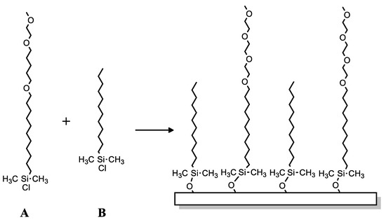- Hoffmann, C.; Tovar, G.E.M. Mixed self-assembled monolayers (SAMs) consisting of methoxy-tri(ethylene glycol)-terminated and alkyl-terminated dimethylchlorosilanes control the non-specific adsorption of proteins at oxidic surfaces. J. Colloid Interface Sci. 2006, 295, 427–435. [Google Scholar] [CrossRef]