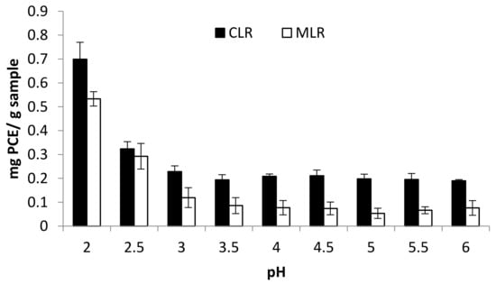 The extraction process was conducted by varying the pH condition within the range of 2 and 6. The result obtained showed an increasing trend in the pH values which invariably triggered a corresponding decrease in the TFC yield for both Malaysia lotus (MLR) and China lotus (CLR) roots extracts, as presented in Figure 1. As the pH rises to a threshold of 2, a higher total flavonoid content was recorded for Malaysia lotus (MLR) and China lotus (CLR) roots extracts with values 0.699 mg PCE/g sample and 0.533 mg PCE/g sample, respectively. The results obtained indicated that the acidic condition is more effective in the total recovery of flavonoid content from MLR and CLR. The synthesized flavonoid from the plant matrix is transported to the vacuoles and cell walls as reported by Agati et al. [12]. However, the acidic environment could result in the disruption of the cellulosic cell walls by breaking the chemical bonds between the flavonoid and cell walls [13]. This subsequently led to an eventual exudation of the flavonoid content and their solubilization in the extraction solvent.