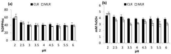 Effect of pH (a) DPPH scavenging activity and (b) ferric-reducing antioxidant power (FRAP).