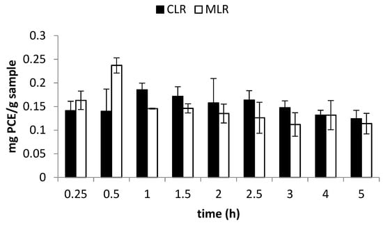 In this study, extraction time was varied from 0.25 to 5 h, at constant pH, solvent-to-sample ratio and temperature. Extract from China lotus root gave the highest TFC at 1 h of extraction time (0.185 mg PCE/g sample), while the lowest TFC was obtained at 5 h of extraction time (0.124 mg PCE/g sample). On the other hand, extract from MLR gave the highest TFC at 0.5 h of extraction (0.237 mg PCE/g sample) while the lowest TFC was obtained at 5 h of extraction (0.114 mg PCE/g sample) (Figure 3).