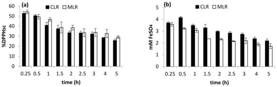 Effect of extraction time on (a) DPPH scavenging activity and (b) ferric-reducing antioxidant power (FRAP).
