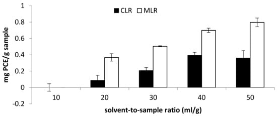 A range of 10–50 mL/g solvent-to-sample ratio was studied in the extraction of phytochemicals from both Malaysia lotus (MLR) and China lotus (CLR) roots. In general, the increase in the solvent-to-sample ratio encouraged the increase in TFC and antioxidant activities in both Malaysia lotus (MLR) and China lotus (CLR) roots extracts. For China lotus root extract, the highest TFC was obtained with the solvent-to-sample ratio of 40 mL/g (0.393 mg PCE/g sample), followed by 50 mL/g (0.359 mg PCE/g sample) and 30 mL/g (0.207 mg PCE/g sample) (Figure 5).
