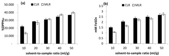 Effect of solvent-to-sample ratio on (a) DPPH scavenging activity and (b) ferric-reducing antioxidant power (FRAP).