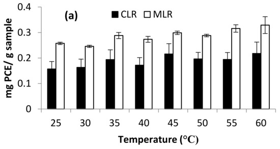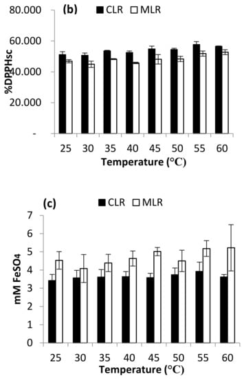 TFC contents extracted from both Malaysia lotus (MLR) and China lotus (CLR) roots with their DPPH and FRAP assays are presented in Figure 7a–c. There were no significant differences in the range of extraction temperature at 25–60 °C. Thus, the effect of temperature was not studied in optimization studies and was set at room temperature as a constant in the further experiment.