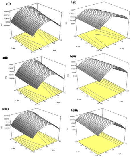 For the TFC of MLR extract, the 3D surfaces as a function of pH and extraction time are given in Figure 8b(i–iii). Results showed that at low solvent-to-sample ratio (20:1, v/w), an increase of TFC could be observed by increasing pH up to pH 2.5. Further increment in pH to pH 3.0 led to a decrease in TFC. A similar trend could be observed at a solvent-to-sample ratio at 30:1 and 40:1 (v/w). Extension in the extraction time showed no significance (p > 0.05) at all three levels of the solvent-to-sample ratio. However, the interaction between pH and extraction time showed a significant (p < 0.05) effect in this experiment. At low solvent-to-sample ratio (20:1, v/w), TFC increased with increasing pH up to 2.25 and extraction time (~1 h) and then decreased at higher pH (~pH 2.75) with further extended extraction period. A similar trend was found at a solvent-to-sample ratio of 30:1 (v/w). On the other hand, at a high solvent-to-sample ratio (40:1, v/w), increasing pH and extraction time led to higher TFC (~0.589 PCE/g sample). Longer extraction time showed higher efficiency in the extraction of flavonoids as it provides sufficient time for the solutes to expose to the extraction solvents. Similar results were obtained by Xu et al. [18]. These results suggested a positive effect of increasing extraction time (less than 2 h) on the extraction of flavonoid from lotus roots.