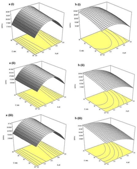 Furthermore, the 3D surfaces for %DPPHsc of CLR extract displayed in Figure 9a(i–iii) showed similar results obtained in TFC. Overall, the time had no significant (p > 0.05) effects, while pH exhibited a major effect on DPPH radical scavenging activity. At fixed extraction time and solvent-to-sample ratio, a maximum %DPPHsc could be observed at region pH 2.5. Lower %DPPHsc were obtained at both the lower and higher pH regions. Interaction between pH and solvent-to-sample ratio contributed a significant (p < 0.05) effect on %DPPHsc. At 0.5 h extraction time, given the increment in solvent-to-sample ratio (from 20 mL/g to 40 mL/g) at low pH (pH 2), only a slight increment in %DPPHsc (~7.74 %DPPHsc) was observed. However, when the pH increased up to 2.5 and above, an apparent increment in %DPPHsc could be observed with the increment of the solvent-to-sample ratio.