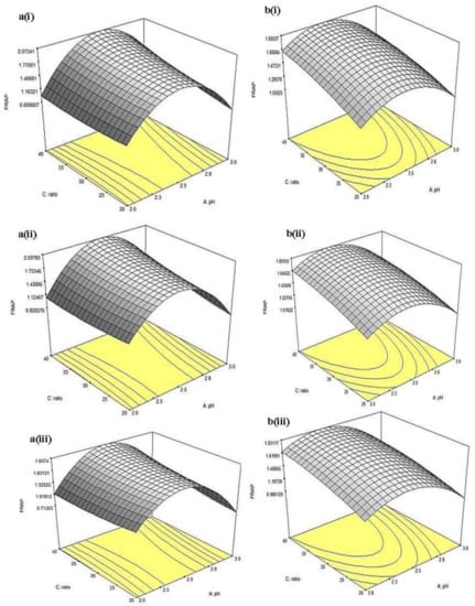 Also, the 3D response surfaces for FRAP of CLR extract as a function of pH and solvent-to-sample ratio are given in Figure 10a(i–iii). In general, pH affected the activity significantly (p < 0.05); from all three levels of extraction time, FRAP value reached maximum (~1.63–1.93 mM FeSO4) at pH~2.25, then decreased with further increment of pH. On the other hand, the solvent-to-sample ratio did not increase significantly (p > 0.05) at all three levels of extraction time. The result showed that the interaction between pH and solvent-to-sample ratio did not significantly (p < 0.05) affect the FRAP of CLR. For FRAP of MLR extract, the 3D response surfaces as a function of pH and solvent-to-sample ratio are given in Figure 10b(i–iii). At 0.5 h of extraction time, increment in solvent-to-sample ratio (from 20:1 to 40:1, v/w) significantly (p < 0.05) increased FRAP value from (~1.059–1.681 mM FeSO4). At the same extraction time, the increment of pH up to pH 2.25 significantly (p < 0.05) increased the FRAP value, from ~1.266 to ~1.473 mM FeSO4 at 20 mL/g solvent-to-sample ratio. However, continuous increment from pH ~2.5 led to a significant (p < 0.05) decrement in FRAP (<1.059 mM FeSO4). Similar to the result obtained from CLR, the interaction between pH and solvent-to-sample ratio did not have a significant (p > 0.05) effect on FRAP assay.