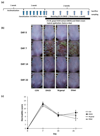 Effects of W. ganpi EtOH extract (WGE) on the development of Atopic dermatitis (AD)-like symptoms induced by 2,4-dinitrochlorobenzene (DNCB) in the dorsal skin of the SKH-1 hairless mice. (a) Summarized diagram of the experiment schedule; (b) Clinical change of the AD-like skin lesion; (c) Dermatitis score. CON: control group, DNCB: DNCB-treated group, W. ganpi: DNCB and 1% W. ganpi EtOH extract-treated group, Elidel: DNCB and Elidel cream treated group. # p < 0.05 vs. the CON group; * p < 0.05 vs. the DNCB group.