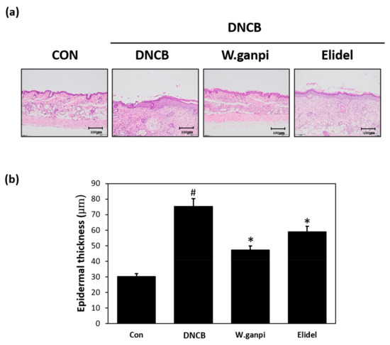 Effects of WGE on the change of the epidermal thickness in AD-like symptoms induced by DNCB in hairless mice. (a) Results of changes in epidermal thickness of skin lesions confirmed by histopathological examination. Stained by Hematoxylin and eosin (H&E) staining; (b) Epidermal thickness. CON: control group, DNCB: DNCB-treated group, W. ganpi: DNCB and 1% W. ganpi EtOH extract-treated group, Elidel: DNCB and Elidel cream treated group. # p < 0.05 vs. the CON group; * p < 0.05 vs. the DNCB group.