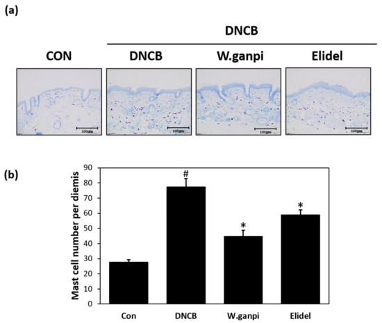 Effects of WGE on the change of the number of mast cells per dermis in AD-like symptoms induced by DNCB in hairless mice. (a) Results of changes in the number of the mast cells per dermis of skin lesion determined by histopathological examination. Stained by toluidine blue; (b) The number of mast cells per dermis. CON: control group, DNCB: DNCB-treated group, W. ganpi: DNCB and 1% W. ganpi EtOH extract-treated group, Elidel: DNCB and Elidel treated group. # p < 0.05 vs. the CON group; * p < 0.05 vs. the DNCB group.