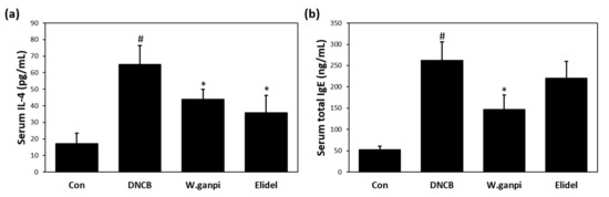 Effects of WGE on the serological change of the IL-4 and IgE concentration in AD-like symptoms induced by DNCB in hairless mice. (a) Serum total IgE levels; (b) Serum total IL-4 levels. # p < 0.05 vs. the CON group; * p < 0.05 vs. the DNCB group.