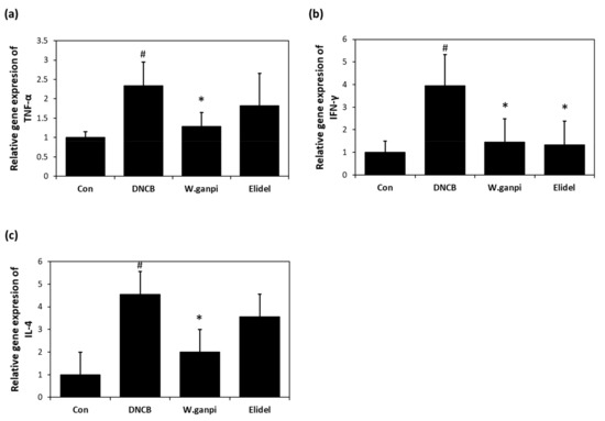 Effects of WGE on the relative gene expression of cytokines TNF-α, IFNγ, and IL-4 DNCB sensitized mouse dorsal skin. (a) The mRNA expression of TNF-α; (b) The mRNA expression of IFNγ; (c) The mRNA expression of IL-4 # p < 0.05 vs. the CON group; * p < 0.05 vs. the DNCB group.