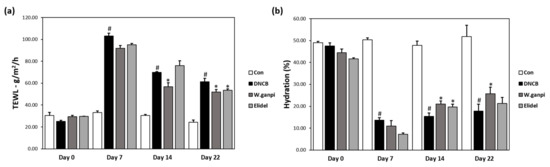 DNCB-induced skin barrier damage increased TEWL and reduced skin hydration. TEWL greatly increased from 29.48 J (g/m2/h) to 91.83 J (g/m2/h) after the 7-days DNCB sensitization period, after which it decreased significantly to 20.0% after 1% WGE and DNCB were co-administered for 14 days (Figure 6a). DNCB application also decreased the value of skin hydration to 27.63% compared to the CON group after the 7-days sensitization (Figure 6b). On day 22, skin hydration levels of the 1% WGE-treated mice significantly restored up to 21.03%. Elidel treatment lowered TEWL to 17.5% compared to the CON group on day 22, and increased the skin hydration level to 21.23% compared to the CON group (Figure 6a,b).