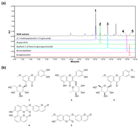HPLC-PDA chromatograms of WGE at 340 nm (a) and chemical structure (b). Peaks: (1) 4-methoxyluteolin-5-O-glucoside; (2) quercitrin; (3) pilloin 5-O-β-d-glucopyranoside; (4) triumbelletin; (5) daphnoretin.