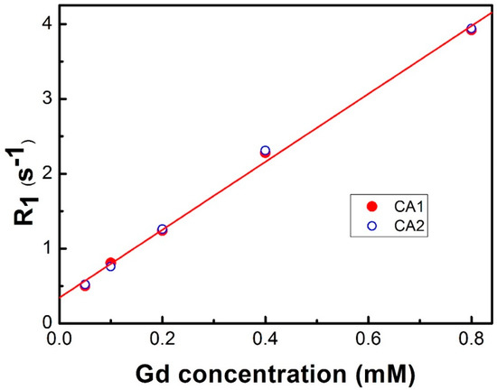 Longitudinal relaxation rate (R1) versus Gd3+ concentration for CA1 (closed red circles) and CA2 (open blue circles) measured at 60 MHz in a 20 mM 4-(2-hydroxyethyl)-1-piperazineethanesulfonic acid (HEPES) buffer (pH 7.2) at 25 °C. The calibrated T1 relaxivities (r1) derived from the linear fittings are 4.54 ± 0.13 and 4.58 ± 0.13 mM−1s−1 for CA1 and CA2, respectively.