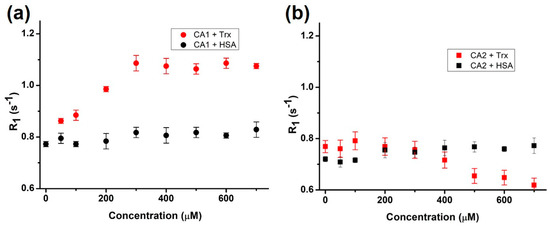 The relaxation rate (R1) of CA1 (a) and CA2 (b) (100 µM each) in the presence of thioredoxin (Trx) and human serum albumin (HSA) at 60 MHz (measurements were replicated in two independent experiments).