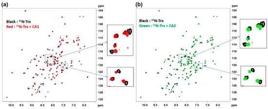 NMR confirmation of Trx interaction with the contrast agents CA1 and CA2. The results of 1H-15N heteronuclear single quantum coherence (HSQC) NMR spectral studies performed using 15N-labeled Trx only, 15N-labeled Trx with CA1 (a), or 15N-labeled Trx with CA2 (b) are shown. Compared with the spectra of Trx alone (black), there are substantial chemical shifts when the contrast agents CA1 and CA2 are added to the 15N-labeled Trx, with both agents being similar in terms of the extent of the induced shift.