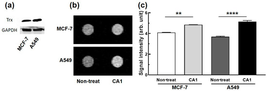 (a) Western blot analyses of Trx expression levels in MCF-7 and A549 cells, (b) representative T1-W MR phantom images of MCF-7 and A549 cells treated with CA1 (100 µM) at 4.7 T, and (c) a quantitative comparison of the MR signal intensities (study replicated in three independent experiments). **, p < 0.01; ****, p < 0.0001 (Student’s t-test).