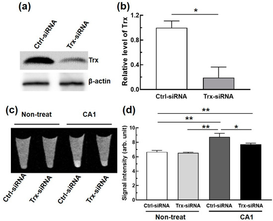 (a) Western blot analyses of Trx expression levels in MCF-7 cells transfected with Trx-siRNA (3 µM, 48 hrs) compared to those of control siRNA (Ctrl-siRNA) and (b) a corresponding quantitative comparison of Trx expression (n = 2). (c) A representative T1-W MR phantom image of MCF-7 cells transfected with Trx-siRNA or Ctrl-siRNA and then treated with CA1 (100 µM) at 200 MHz at room temperature, and (d) a comparison of the corresponding signal intensities (n = 3). *, p < 0.05; **, p < 0.01 (Student’s t-test).