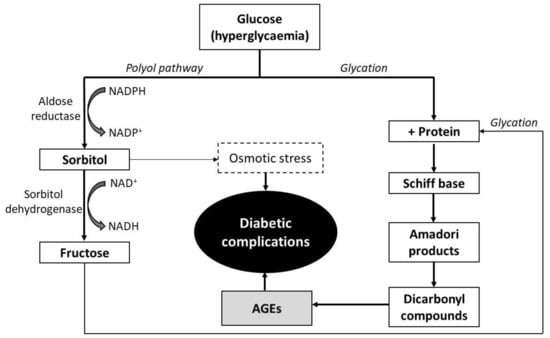 Chronic hyperglycemia is fundamental for the development and progression of diabetic micro- and macrovascular complications through various hyperglycemia-induced metabolic derangements, namely increased polyol pathway flux and increased advanced glycation end-products (AGEs) formation [28,36]. Aldose reductase is the first enzyme of the polyol pathway that catalyzes reduction of glucose to sorbitol [27] (Figure 2).