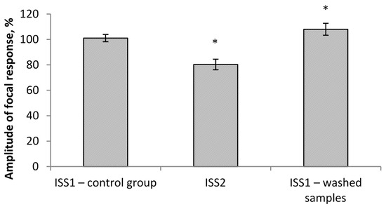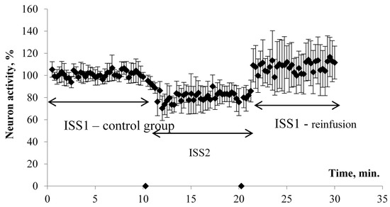 The effect developed gradually and came to its maximum value on average 1.5–2 min after the switch of the flow and reached a plateau. At the same time, the PS amplitude was significantly reduced by 20% in comparison to the control group/ISS1 sample. When switching back from ISS2 to ISS1, there was a gradual restoration of the PS amplitude in all cases. The maximum effect was observed on average 1–1.5 min after the reinfusion started. The value of the restored PS was 108% of the initial value. Thus, a ten-minute incubation of the sections in the low deuterium medium led to a significant decrease of rats’ hippocampal neuron activity. The return of the slices to the incubation medium with the natural content of deuterium led not only to recovery but also to the increased hippocampal neuron population activity in comparison to the control value.