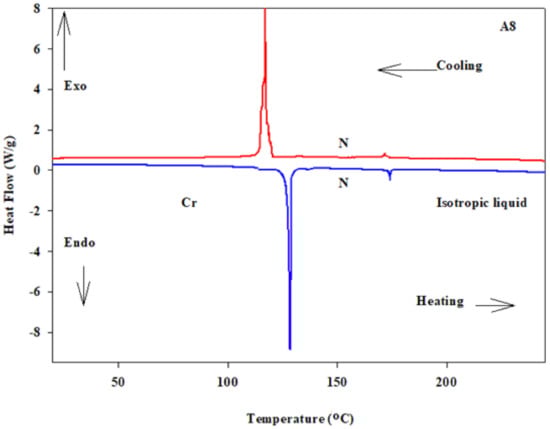 DSC thermograms of A8 derivative upon second heating-cooling scan with a rate of 10 °C/min.