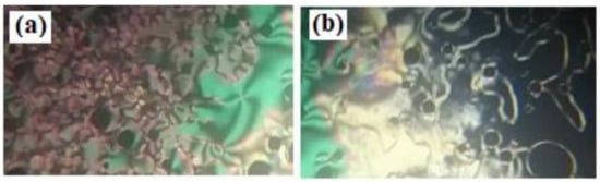 POM images of N mesophase upon heating of compound A8 at (a) 158.0 °C and (b) 172.0 °C.