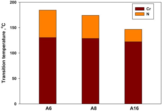 Nearly identical FT-IR spectra were observed for all investigated An series (Figures S3–S5, Supplementary Materials) that may be attributed to the length of the terminal alkoxy chain and does not significantly affect the location of the main characteristic FT-IR absorption bands of the investigated compounds. The effect on the C=O moiety with the slight change in the polarity character of the terminal chains was in the range of 8.0 cm−1 (1727 cm−1 for A16, 1729 cm−1 for A6 and 1729 cm−1 for A8), while that for the C=N was 16 cm−1 (1591–1607 cm−1). It can be concluded that the little change of the polarity of the terminal alkoxy chains has a small effect on the polarization of the ester C=O and –CH=N– groups.