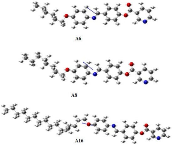 In order to study the effect of linking and terminal alkoxy chain groups on the mesomorphic properties of the present homologs An, computational calculations for each member of the investigated series were studied. The correlations were recognized between the quantum chemical parameters, derived by DFT theoretical calculations, and the experimental data variables for the synthesized series An. Calculations were estimated in the gas phase at B3LYP/6-311g(d,p) for predicting the optimum and most stable molecular geometries. Computational calculations were performed by Gaussian 09W package (Gaussian, Inc., Wallingford CT, USA) [44]. Data revealed that all compounds exhibit planar geometry with semi-linear molecular structure. Moreover, the length of terminal flexible chain highly impacts the structural geometry of the molecule (Figure 4).