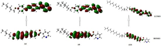 The calculated total energy of the synthesized homologs series An and the other thermal parameters (thermal energy, enthalpy, Gibb’s free energy and entropy) at room temperature were estimated at the same level of theory and are summarized in Table 2. Moreover, other predicted parameters are collected in Table 3. Table 2 and Table 3 data show that the thermal and geometrical parameters predicted from DFT calculations are highly affected by the electronic conjugation of the linking groups. Moreover, the energy gap (∆E) between HOMO and LUMO levels is an indicator of the chemical reactivity of compounds. The lower its value, the more reactive the molecule would be. The predicted energy gap collected in Table 3 affirms the A6 to be more reactive than others. It is also softer than others as the energy gap is inversely related to the softness. On the other hand, the lower ionization potential (I.E) calculated for the A16 derivative indicates a more basic nature than others in the series.