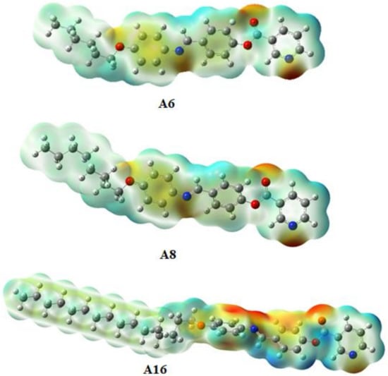 Charge distribution maps for the investigated group An were predicted under the same basis sets according to molecular electrostatic potential (MEP, Figure 6). The negatively charged atomic sites (red regions) were localized on the oxygen atoms and the nitrogen atom of the Schiff base linkage as well as the nitrogen of the hetero-terminal ring. While the alkyl chain showed the least negatively charged atomic sites (blue regions). As shown from Figure 6, the length of the terminal alkoxy group and the conformation of the attached aromatic ring are more effective on the orientation of the charge distribution map; this could affect the thermal nematic stability of the mesophase by alteration of the competitive interaction between end-to-end and side-side interaction. The measurements of theoretical charge distribution and the mesomorphic properties correlation were recently documented [26]. The alteration of the charge distribution on the whole molecules due to mesomeric interactions enhances the terminal aggregation to induce the N mesophase. Furthermore, the geometrical structure of the attached flexible chain affects the charge distribution map orientation. It was found that the longest terminal alkoxy group (A16) of the present homologs has the highest effect on the localization of the isoelectron density of the electron-rich and electron-deficient regions.