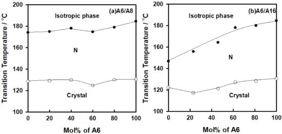 Binary phase diagram of (a) A6/A8 and (b) A6/A16. “○” denotes crystal–nematic transition, and “●” denotes nematic–isotropic liquid transition.