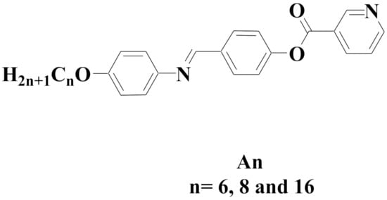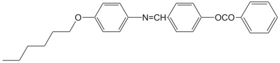 Insertion of heterocyclic pyridine ring in the LCs’ skeletons strongly impacts their polarizability and/or polarity as well as their geometric structures. Consequently, it extensively affects the phase transition temperature, types of mesophase and other physical and geometrical parameters essential for better properties of the LC materials [11]. Incorporation of Schiff base and ester linking groups widely improves many properties of LCs. This could be attributed to their rigidity that enhances the stability of LC mesophases [12,13]. These modifications in the properties of the LCs may be beneficial for mesomorphism as well as the physical properties necessary for technical uses. Schiff base linkages have been broadly employed in the preparation of numerous LC derivatives [14,15,16,17]. Most reports are focused on Schiff bases since the discovery of nematogenic 4-methoxybenzylidene-4′-butylaniline at room temperature [18]. Recently, several thermotropic Schiff base/ester liquid crystals have been documented [19,20,21].