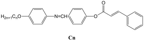 Nowadays, liquid crystals (LCs) based on organic derivatives prove to have broad areas of industrial applications as optical technology and photoconductors [1,2,3]. Structural–characteristic relationships are important approaches to prepare compatible geometrical shapes to achieve the essential properties for recent technological applications [4,5,6,7]. Selection of attached substituents, flexible chains and mesogenic spacers are important criteria in the designing of proper thermotropic LCs for applications. Modifications in the molecular architectures lead to change in the mesomorphic behavior and play important roles in the formation, kind and thermal stability of the produced mesophase [8,9,10].