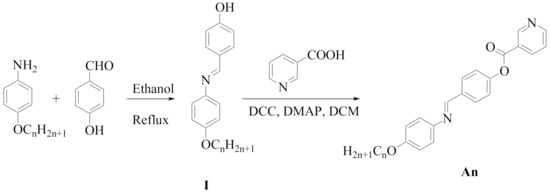 Preparation of 4-(4-(alkoxy)phenylimino)methyl)phenyl nicotinate (An).