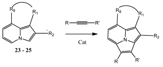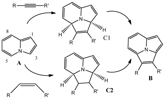 Indolizines (A) in [8+2] cycloaddition reaction forming cycl[3.2.2]azines (B). The reaction may proceed with alkynes or alkenes via dihydro- (C1) or tetrahydro- (C2) cyclazines.