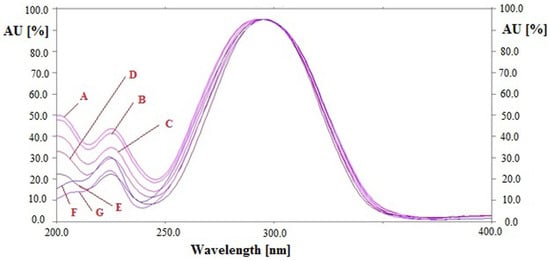 Overlaid ultra-violet (UV) absorption spectra of (A) standard CCHO and EOH, (B) CCHO and EOH in essential oil of Cinnamomum zeylanicum, (C) CCHO and EOH in essential oil of C. burmannii, (D) CCHO and EOH in essential oil of C. cassia, (E) CCHO and EOH in methanolic extract of C. zeylanicum, (F) CCHO and EOH in methanolic extract of C. burmannii and (G) CCHO and EOH in methanolic extract of C. cassia.