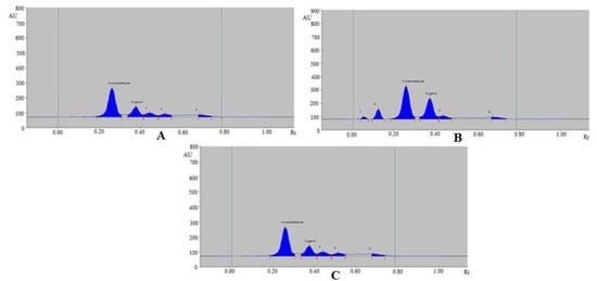 From the obtained results, it was observed that the solvent systems cyclohexane/ethyl acetate (50:50, v v−1), cyclohexane/ethyl acetate (60:40, v v−1), cyclohexane/ethyl acetate (70:30, v v−1), and cyclohexane/ethyl acetate (80:20, v v−1) offered the poor densitometry peaks of CCHO and EOH with poor asymmetry/tailing factor (As) values for CCHO (As ˃ 1.30) and EOH (As ˃ 1.35). However, when the solvent system cyclohexane/ethyl acetate (90:10, v v−1) was studied, it was observed that this solvent system offered a well-separated and intact chromatographic peak of CCHO at Rf = 0.27 ± 0.01 and of EOH at Rf = 0.38 ± 0.01 (Figure 2). In addition, the As values of CCHO and EOH were found to be 1.04 and 1.10, which are highly acceptable. Accordingly, the cyclohexane/ethyl acetate (90:10, v v−1) solvent system was optimized as the mobile phase for the simultaneous estimation of CCHO and EOH in essential oils and traditional and ultrasound-assisted extracts of different species of cinnamon. The spectral bands for CCHO and EOH were obtained under densitometry mode and maximum response under reflectance/absorbance mode was obtained at the wavelength (λmax) = 296 nm for CCHO and EOH (Supplementary Materials Table S1). Hence, the entire simultaneous estimation of CCHO and EOH was carried out at λmax = 296 nm.